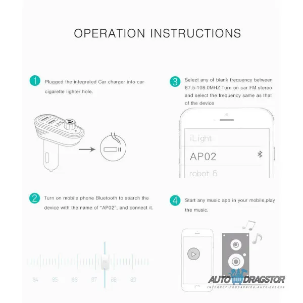 - FM PREDAJNIK (TRANSMITER), 2 USB ULAZA, BLUETOOTH 5.0 MP3/WMA