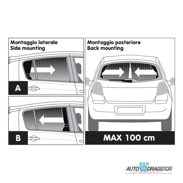 Uključuje aluminijumske šine sa 3M lepljivom podlogom za jednostavnu instalaciju. Dizajn savitljivih šipki omogućava prilagođavanje veličini i univerzalnu montažu. Postavljaju se 2 zavese jedna pored druge kako bi se pokrila zadnja stakla.